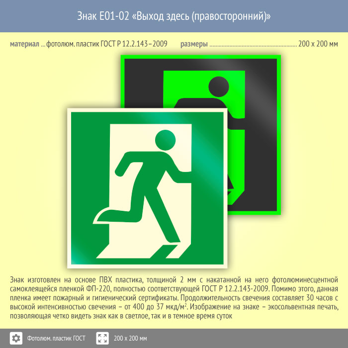 Знак E01-02 «Выход здесь (правосторонний)» (фотолюминесцентный пластик ГОСТ 34428-2018, 200х200 мм) в Кашире купить
