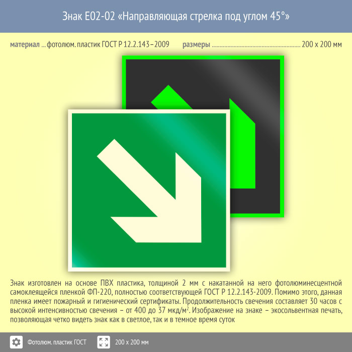 Знак E02-02 «Направляющая стрелка под углом 45°» (фотолюминесцентный пластик ГОСТ 34428-2018, 200х200 мм) в Кашире купить