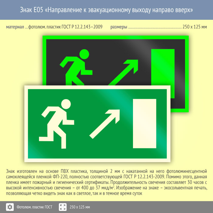 Знак E05 «Направление к эвакуационному выходу направо вверх» (фотолюминесцентный пластик ГОСТ 34428-2018, 250х125 мм) в Кашире купить