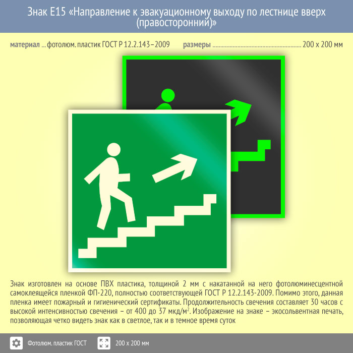 Знак E15 «Направление к эвакуационному выходу по лестнице вверх (правосторонний)» (фотолюминесцентный пластик ГОСТ 34428-2018, 200х200 мм) в Кашире купить