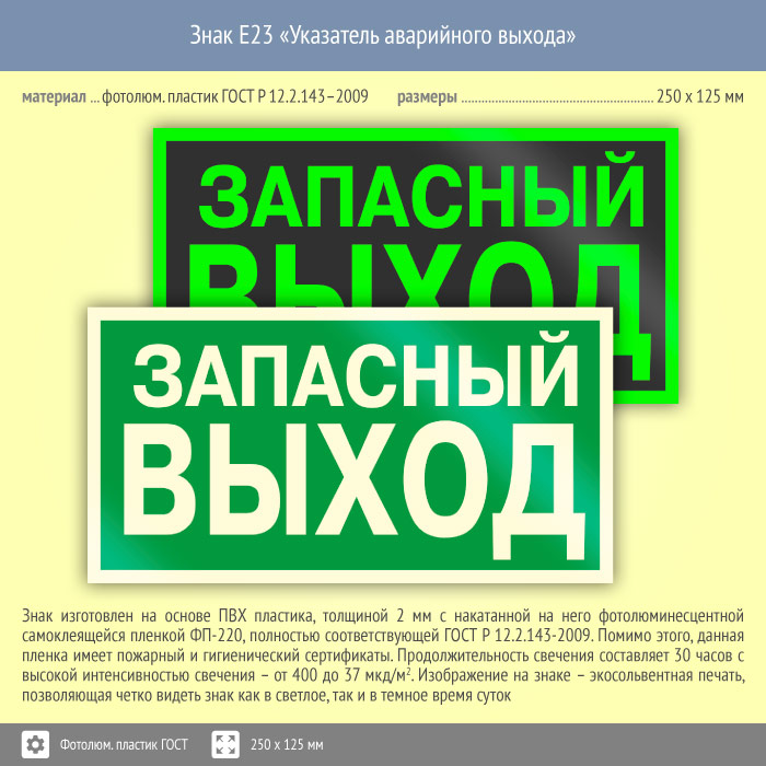 Знак E23 «Указатель запасного выхода» (устаревший) (фотолюминесцентный пластик ГОСТ 34428-2018, 250х125 мм) в Кашире купить