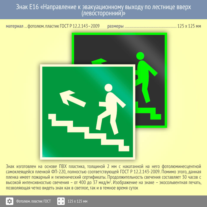 Знак E16 «Направление к эвакуационному выходу по лестнице вверх (левосторонний)» (фотолюминесцентный пластик ГОСТ 34428-2018, 125х125 мм) в Кашире купить