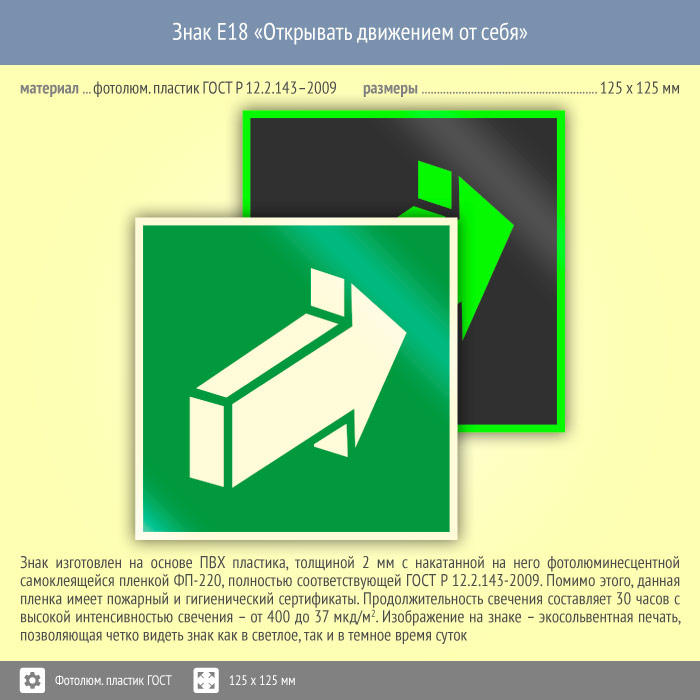 Знак E18 «Открывать движением от себя» (фотолюминесцентный пластик ГОСТ 34428-2018, 125х125 мм) в Кашире купить