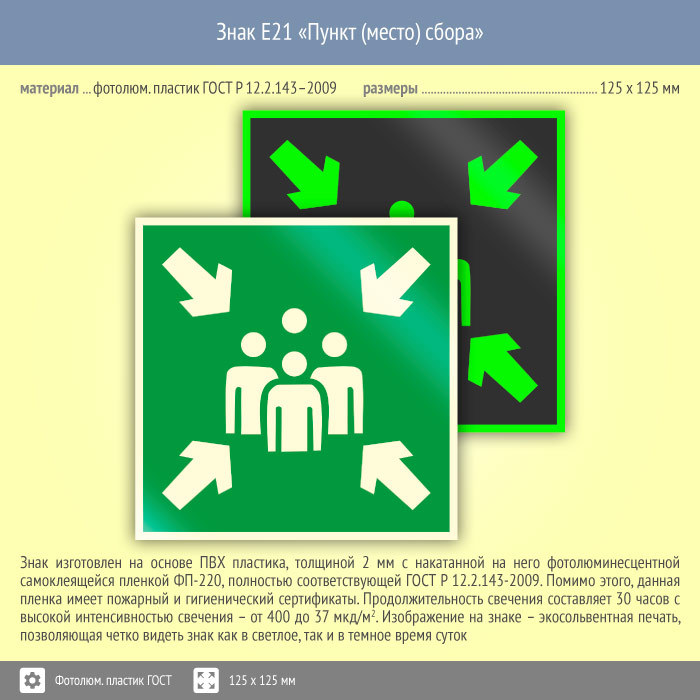 Знак E21 «Пункт (место) сбора» (фотолюминесцентный пластик ГОСТ 34428-2018, 125х125 мм) в Кашире купить