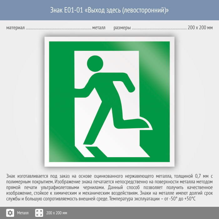 Знак E01-01 «Выход здесь (левосторонний)» (металл, 200х200 мм) в Кашире купить