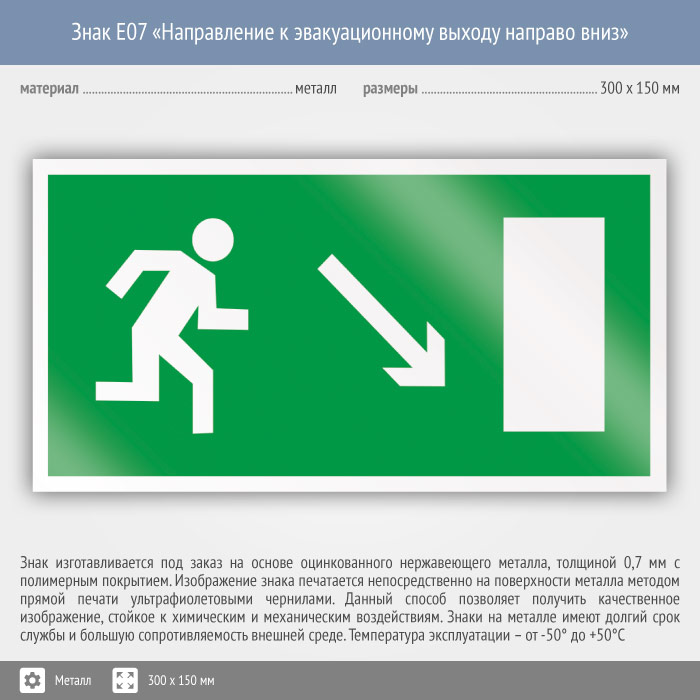 Знак E07 «Направление к эвакуационному выходу направо вниз» (металл, 300х150 мм) в Кашире купить
