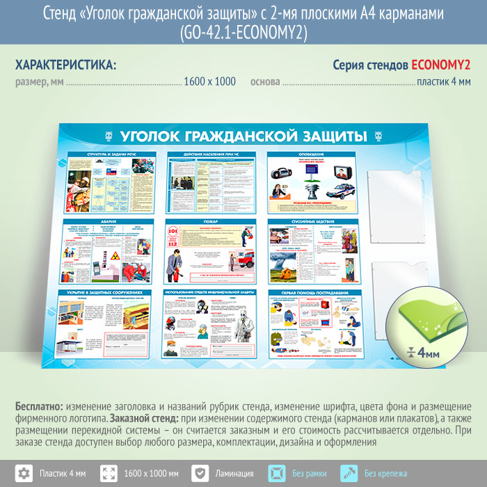 Стенд «Уголок гражданской защиты» с 2-мя плоскими А4 карманами (GO-42.1-ECONOMY2) в Кашире купить
