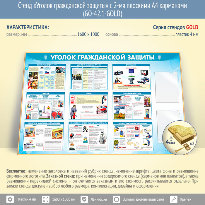 Стенд «Уголок гражданской защиты» с 2-мя плоскими А4 карманами (GO-42.1-GOLD) в Кашире купить
