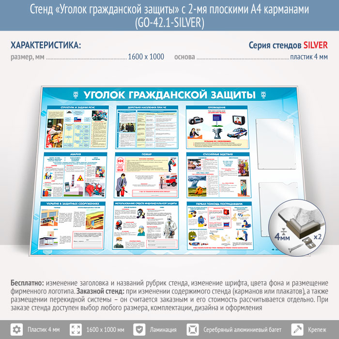 Стенд «Уголок гражданской защиты» с 2-мя плоскими А4 карманами (GO-42.1-SILVER) в Кашире купить