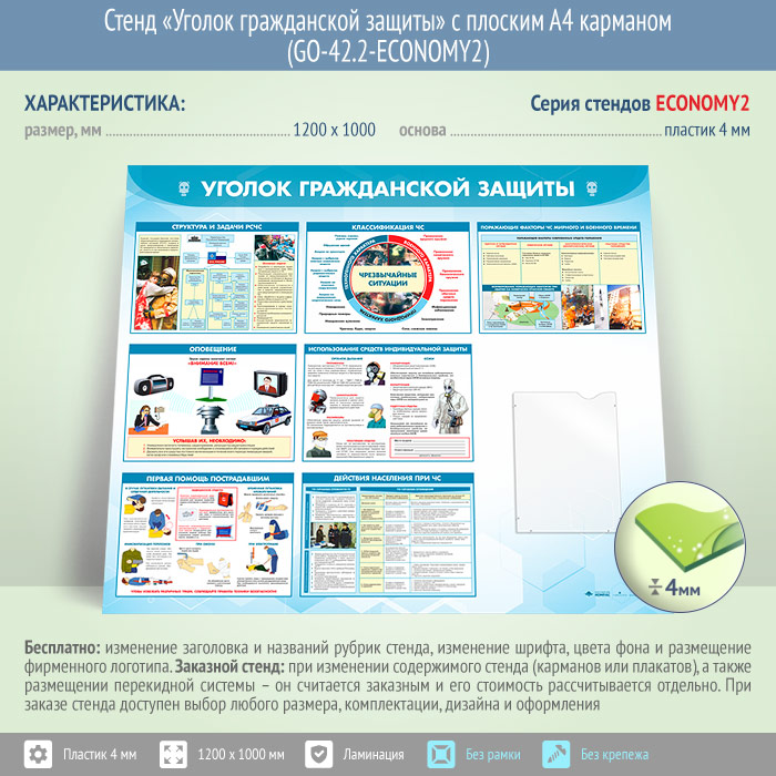 Стенд «Уголок гражданской защиты» с плоским А4 карманом (GO-42.2-ECONOMY2) в Кашире купить