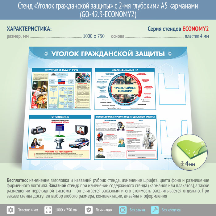 Стенд «Уголок гражданской защиты» с 2-мя глубокими А5 карманами (GO-42.3-ECONOMY2) в Кашире купить