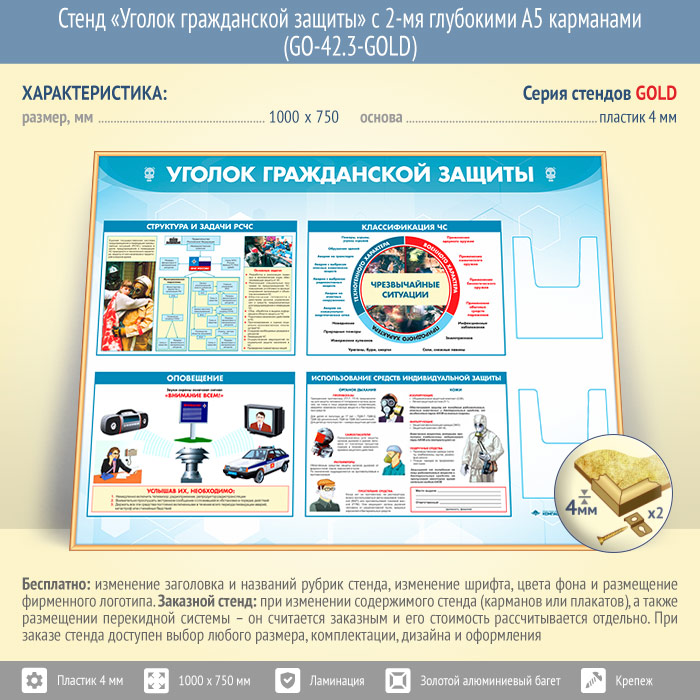 Стенд «Уголок гражданской защиты» с 2-мя глубокими А5 карманами (GO-42.3-GOLD) в Кашире купить