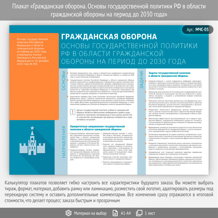 Плакат «Гражданская оборона. Основы государственной политики РФ в области гражданской обороны на период до 2030 года» (МЧС-05, 1 лист) в Кашире купить