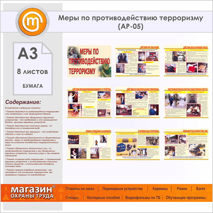 Плакаты «Меры по противодействию терроризму» (АР-05, бумага, А3, 8 листов) в Кашире купить