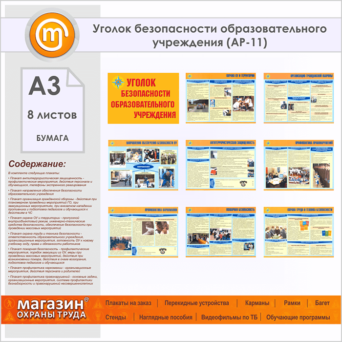 Плакаты «Уголок безопасности образовательного учреждения» (АР-11, бумага, А3, 8 листов) в Кашире купить