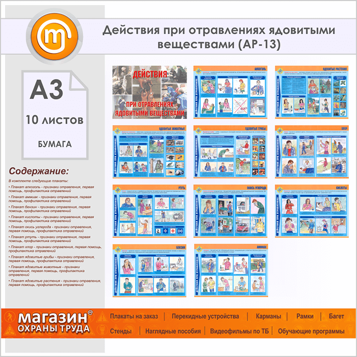 Плакаты «Действия при отравлениях ядовитыми веществами» (АР-13, бумага, А3, 10 листов) в Кашире купить