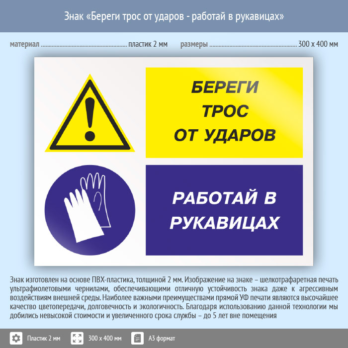 Знак «Береги трос от ударов - работай в рукавицах», КЗ-03 (пластик, 400х300 мм) в Кашире купить