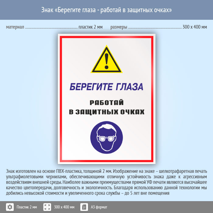 Знак «Берегите глаза - работай в защитных очках», КЗ-04 (пластик, 300х400 мм) в Кашире купить