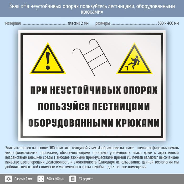 Знак «На неустойчивых опорах пользуйтесь лестницами, оборудованными крюками», КЗ-22 (пластик, 400х300 мм) в Кашире купить