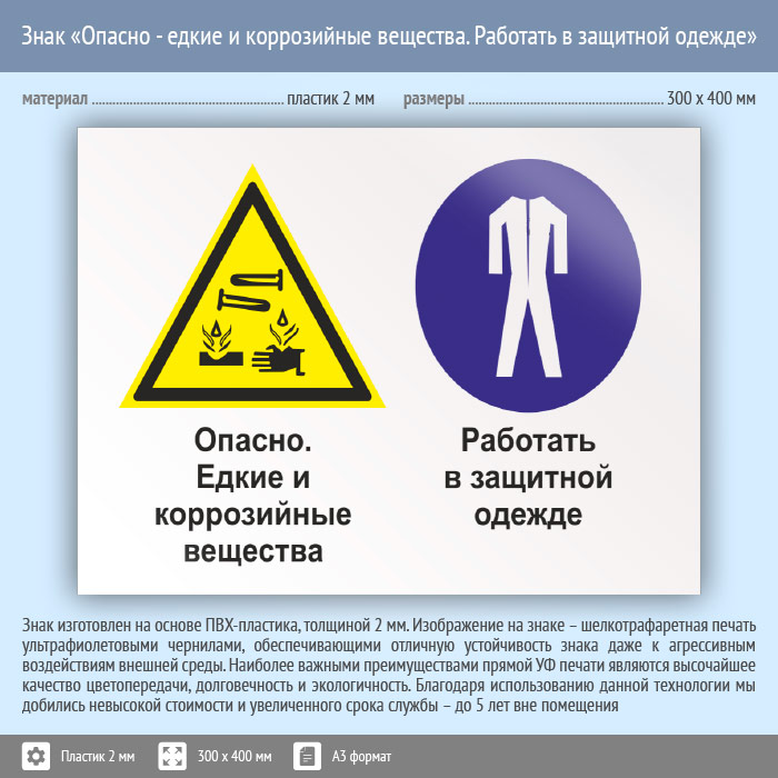 Знак «Опасно - едкие и коррозийные вещества. Работать в защитной одежде», КЗ-35 (пластик, 400х300 мм) в Кашире купить