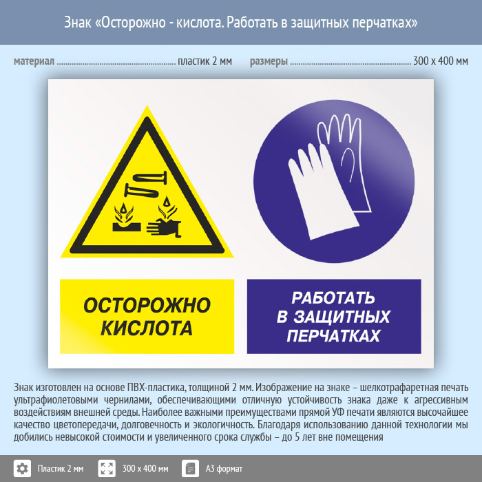 Знак «Осторожно - кислота. Работать в защитных перчатках», КЗ-56 (пластик, 400х300 мм) в Кашире купить