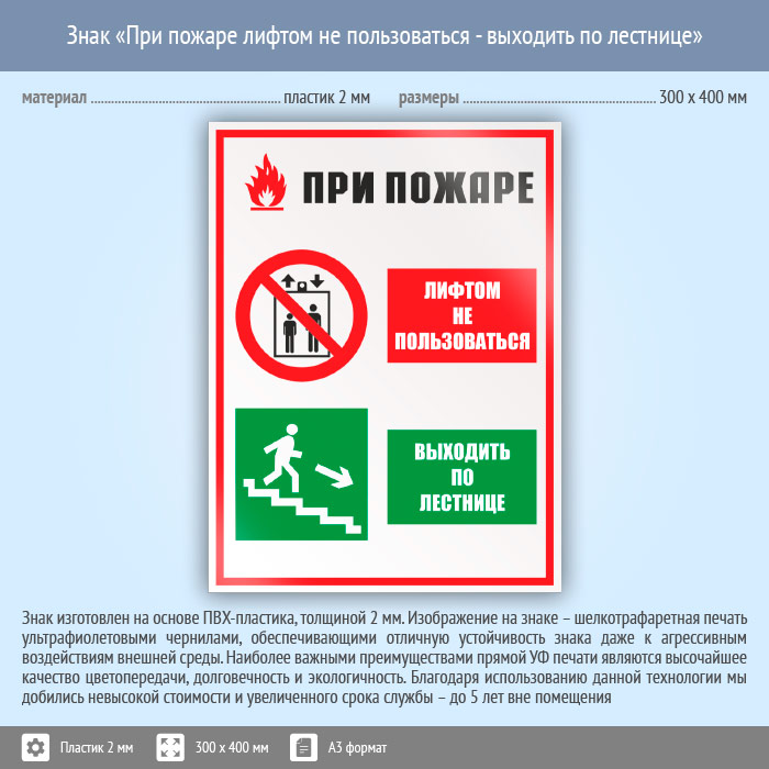 Знак «При пожаре лифтом не пользоваться - выходить по лестнице», КЗ-73 (пластик, 300х400 мм) в Кашире купить