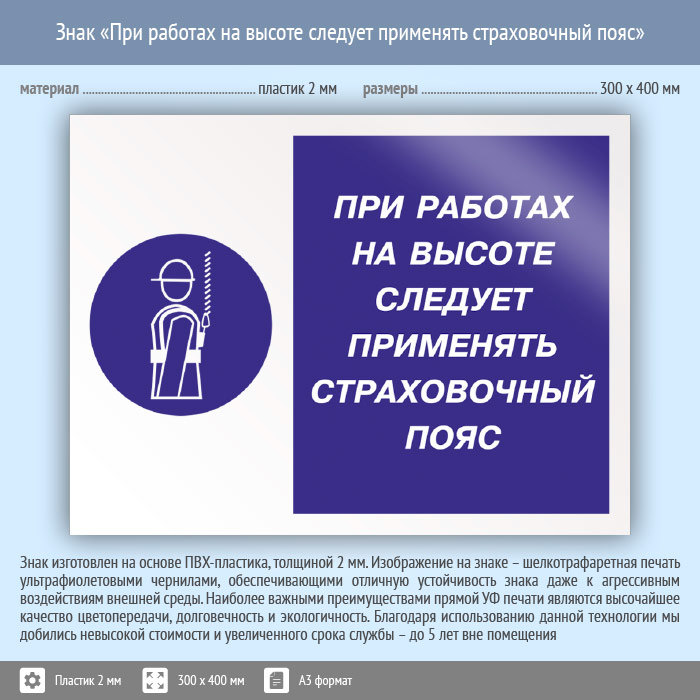 Знак «При работах на высоте следует применять страховочный пояс», КЗ-75 (пластик, 400х300 мм) в Кашире купить