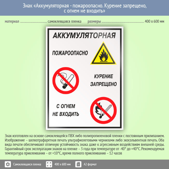 Знак «Аккумуляторная - пожароопасно. Курение запрещено, с огнем не входить», КЗ-01 (пленка, 400х600 мм) в Кашире купить