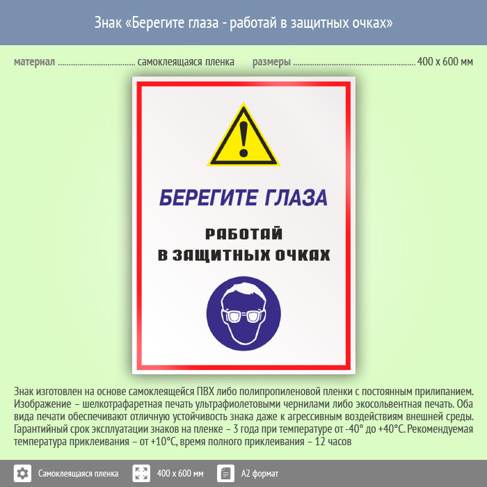 Знак «Берегите глаза - работай в защитных очках», КЗ-04 (пленка, 400х600 мм) в Кашире купить