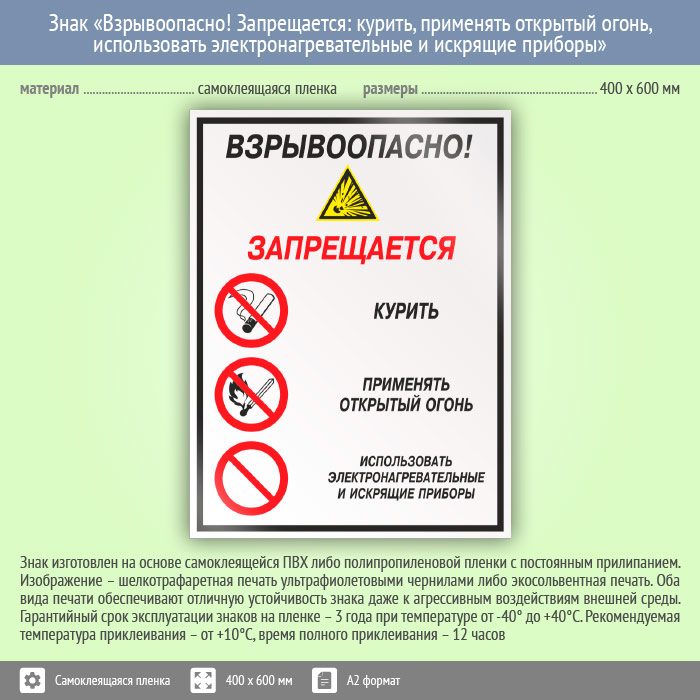 Знак «Взрывоопасно! Запрещается: курить, применять открытый огонь, использовать электронагревательные и искрящие приборы», КЗ-10 (пленка, 400х600 мм) в Кашире купить