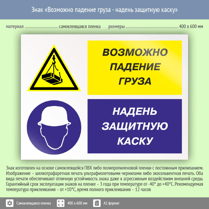 Знак «Возможно падение груза - надень защитную каску», КЗ-17 (пленка, 600х400 мм) в Кашире купить
