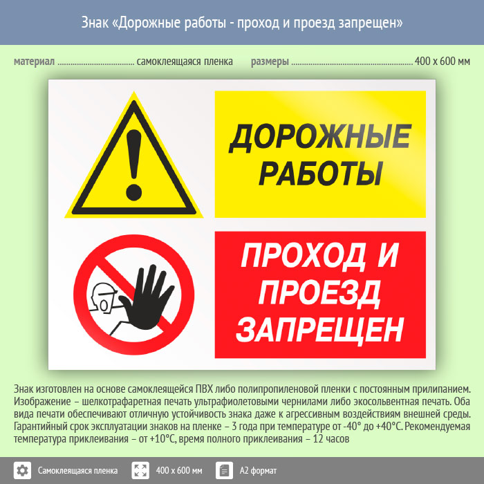 Знак «Дорожные работы - проход и проезд запрещен», КЗ-20 (пленка, 600х400 мм) в Кашире купить