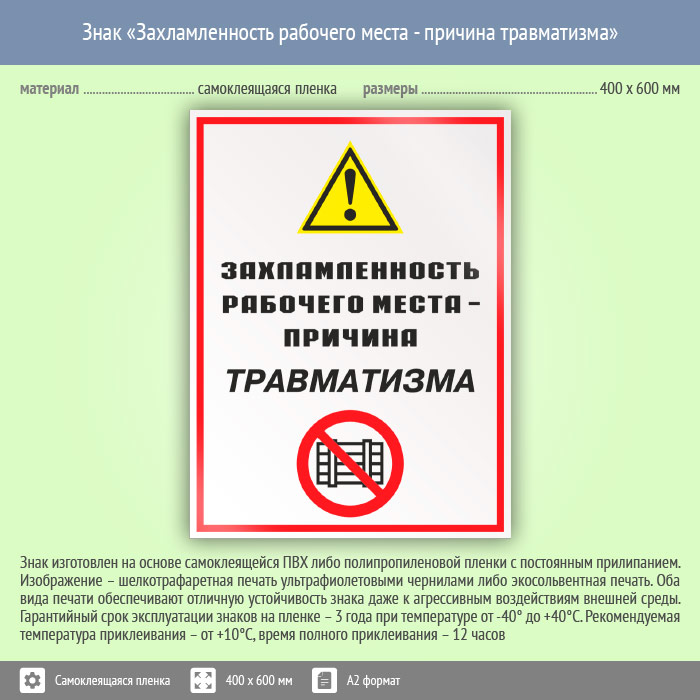 Знак «Захламленность рабочего места - причина травматизма», КЗ-21 (пленка, 400х600 мм) в Кашире купить