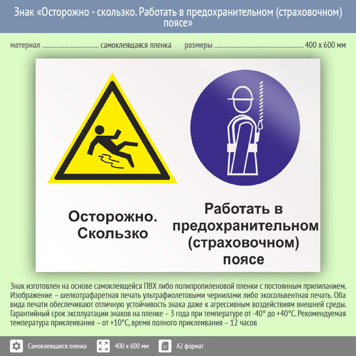 Знак «Осторожно - скользко. Работать в предохранительном (страховочном) поясе», КЗ-58 (пленка, 600х400 мм) в Кашире купить