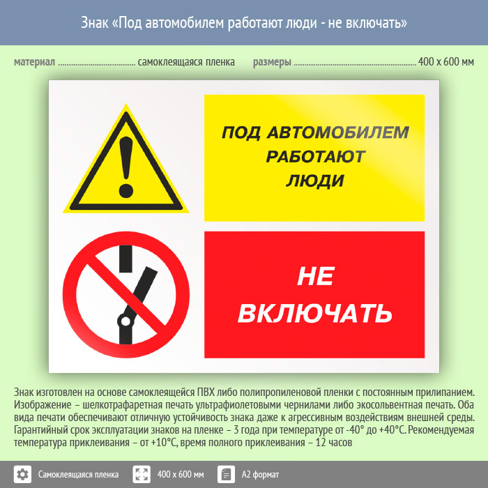 Знак «Под автомобилем работают люди - не включать», КЗ-65 (пленка, 600х400 мм) в Кашире купить
