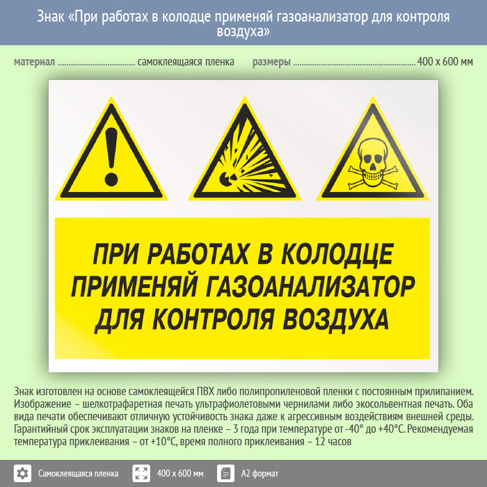 Знак «При работах в колодце применяй газоанализатор для контроля воздуха», КЗ-74 (пленка, 600х400 мм) в Кашире купить