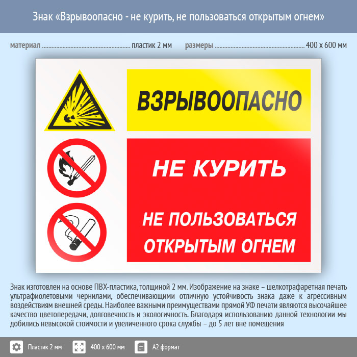 Знак «Взрывоопасно - не курить, не пользоваться открытым огнем», КЗ-05 (пластик, 600х400 мм) в Кашире купить