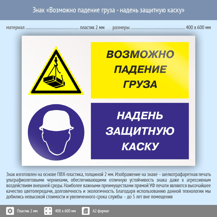 Знак «Возможно падение груза - надень защитную каску», КЗ-17 (пластик, 600х400 мм) в Кашире купить