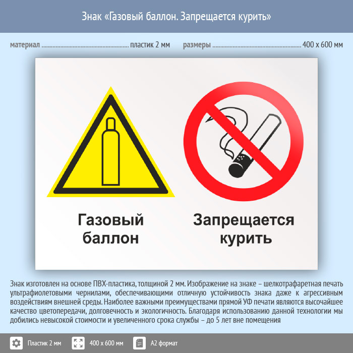 Знак «Газовый баллон. Запрещается курить», КЗ-18 (пластик, 600х400 мм) в Кашире купить