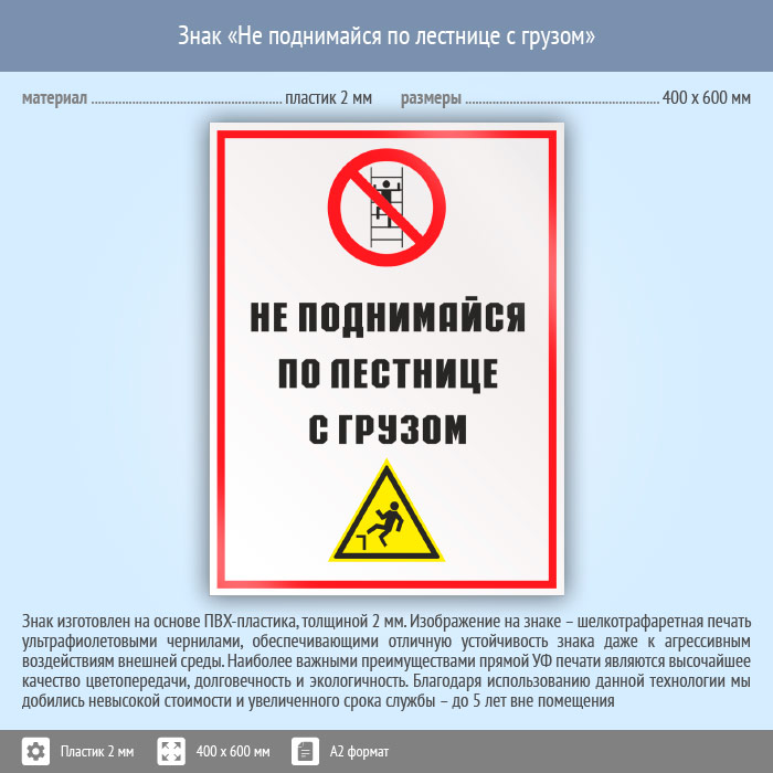 Знак «Не поднимайся по лестнице с грузом», КЗ-28 (пластик, 400х600 мм) в Кашире купить