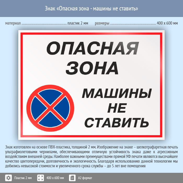 Знак «Опасная зона - машины не ставить», КЗ-32 (пластик, 600х400 мм) в Кашире купить