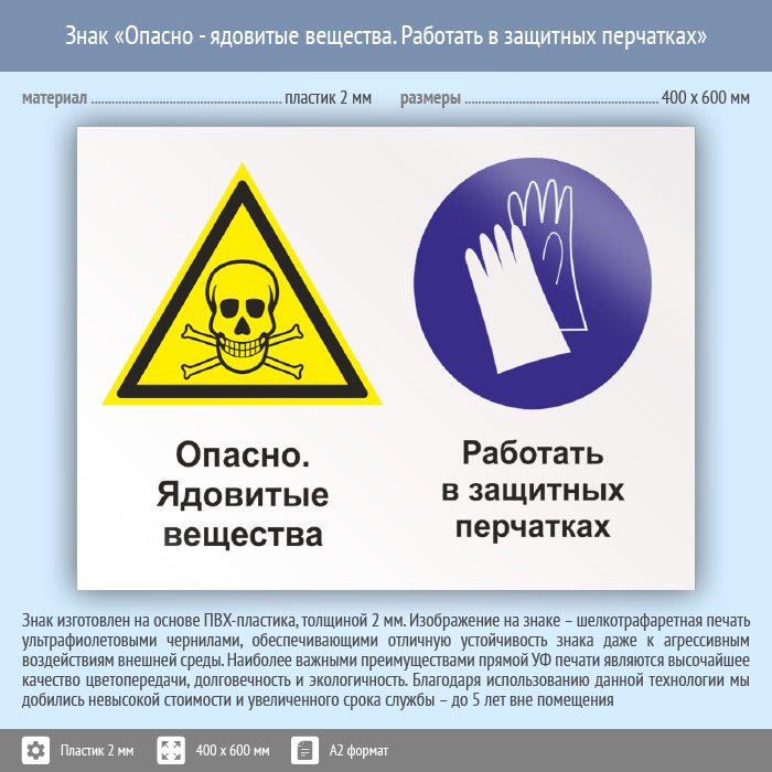 Знак «Опасно - ядовитые вещества. Работать в защитных перчатках», КЗ-43 (пластик, 600х400 мм) в Кашире купить