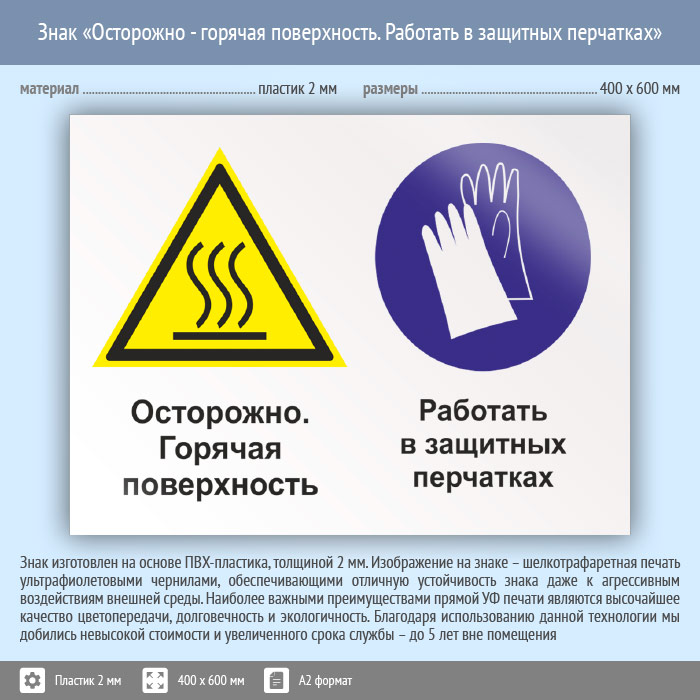 Знак «Осторожно - горячая поверхность. Работать в защитных перчатках», КЗ-55 (пластик, 600х400 мм) в Кашире купить