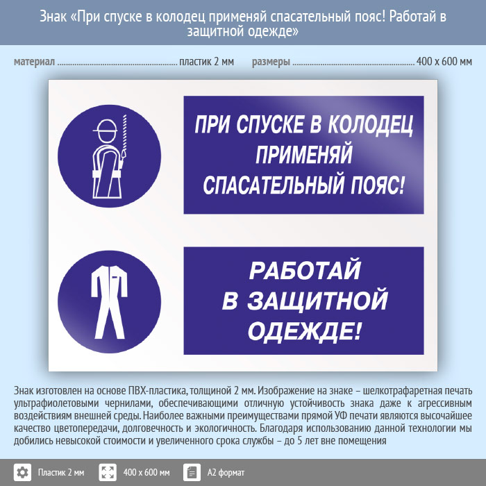 Знак «При спуске в колодец применяй спасательный пояс! Работай в защитной одежде», КЗ-76 (пластик, 600х400 мм) в Кашире купить
