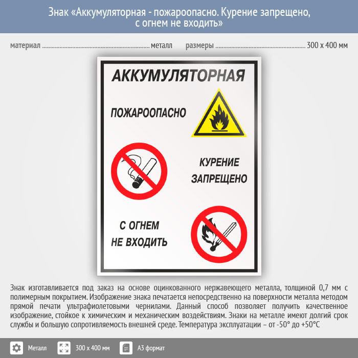 Знак «Аккумуляторная - пожароопасно. Курение запрещено, с огнем не входить», КЗ-01 (металл, 300х400 мм) в Кашире купить
