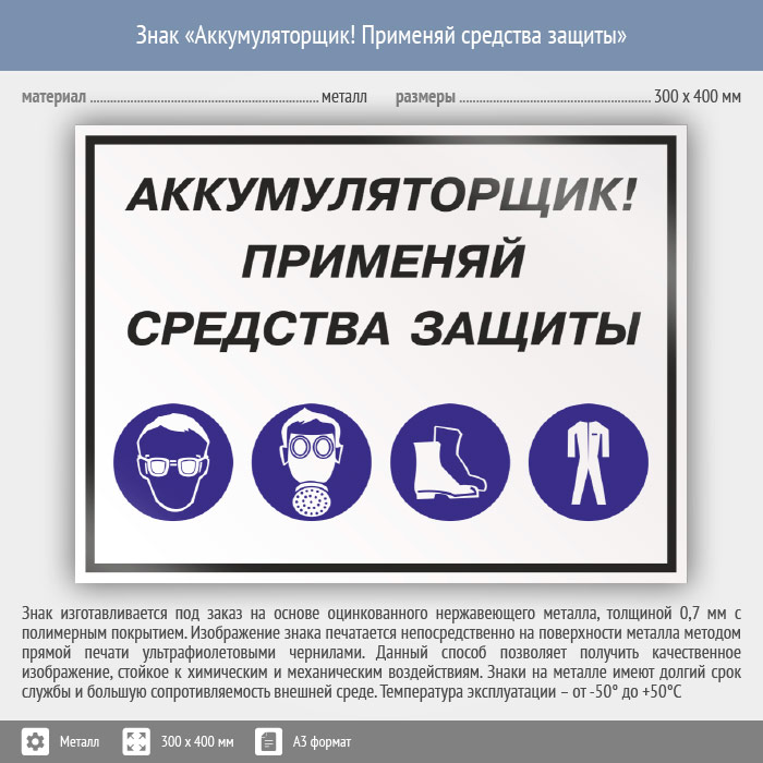 Знак «Аккумуляторщик! Применяй средства защиты», КЗ-02 (металл, 400х300 мм) в Кашире купить