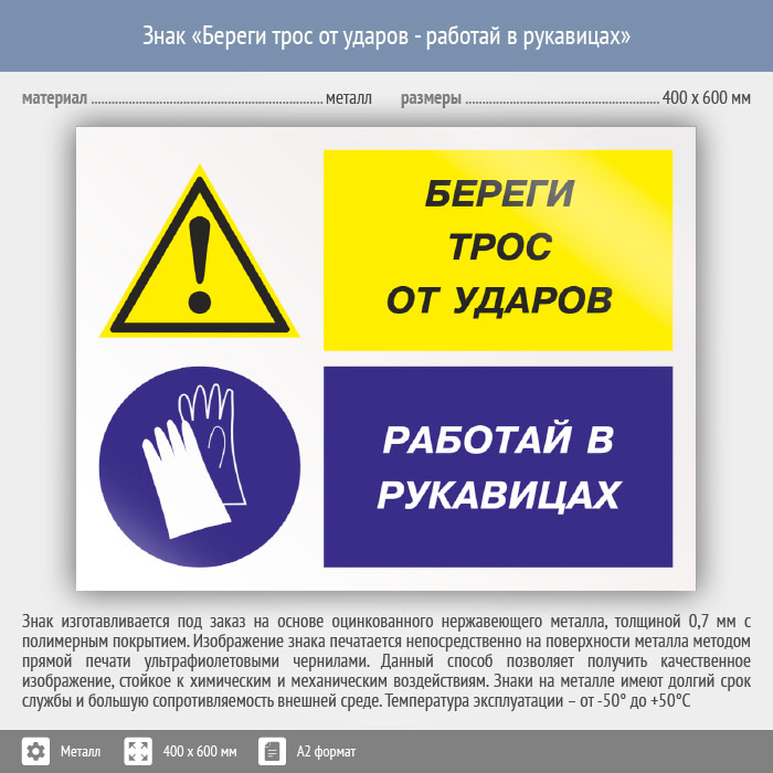 Знак «Береги трос от ударов - работай в рукавицах», КЗ-03 (металл, 600х400 мм) в Кашире купить