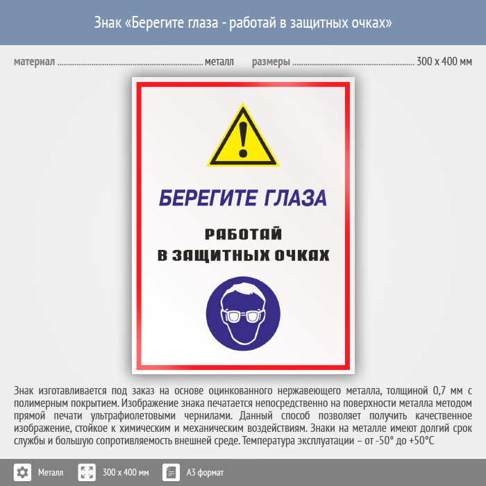 Знак «Берегите глаза - работай в защитных очках», КЗ-04 (металл, 300х400 мм) в Кашире купить