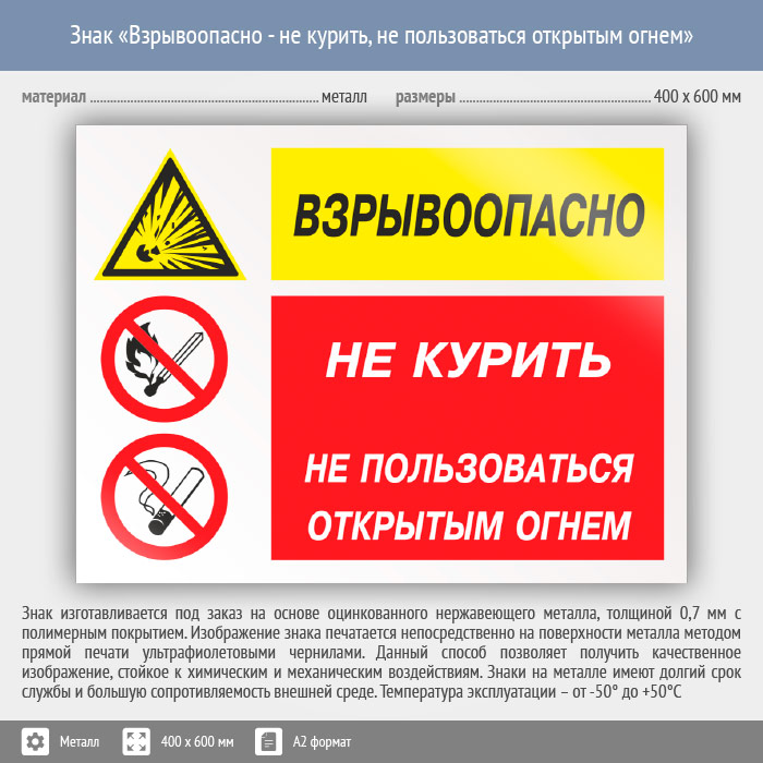 Знак «Взрывоопасно - не курить, не пользоваться открытым огнем», КЗ-05 (металл, 600х400 мм) в Кашире купить
