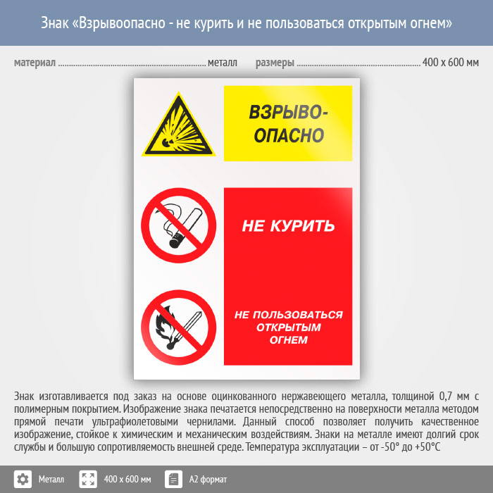 Знак «Взрывоопасно - не курить и не пользоваться открытым огнем», КЗ-08 (металл, 400х600 мм) в Кашире купить